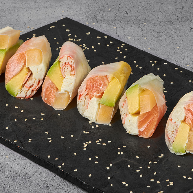 3 Rollitos de papel de arrroz rellenos con salmón fresco, kanikama, aguacate, yacón, y queso philadelphia. Acompañados con salsa de chile dulce.