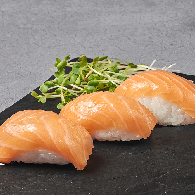 3 Nigiris de arroz de sushi cubierto de salmón fresco