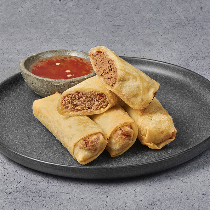 4 Rollitos rellenos con carne de res y vegetales. Acompañados con salsa de chile dulce.