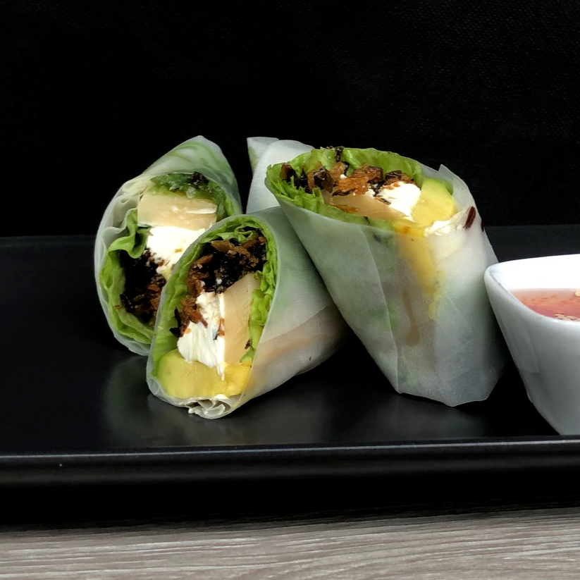 3 vietnamitas de papel de arroz rellenos con lechuga crespa, catzura de zanahoria, yacon, ensalada de algas, aguacate, puerro caramelizado y queso philadelphia. acompañado con salsa chile dulce y soya.