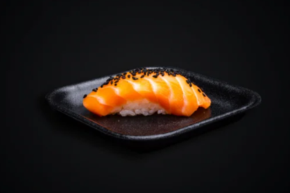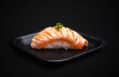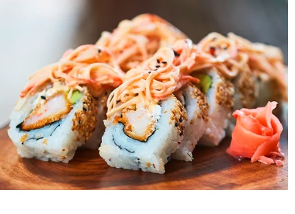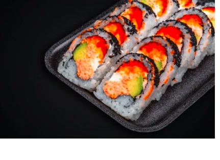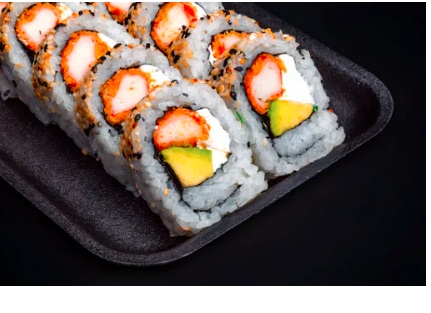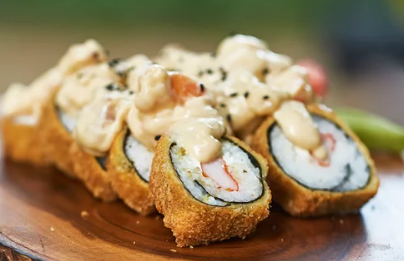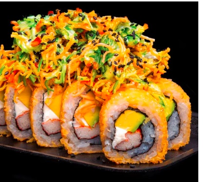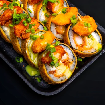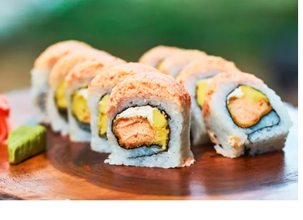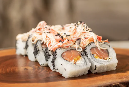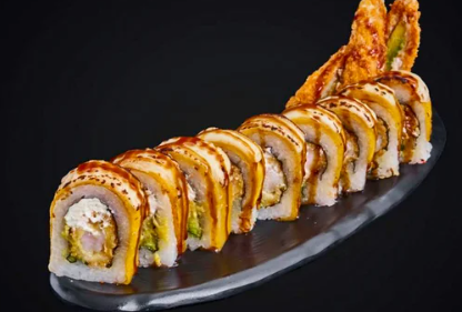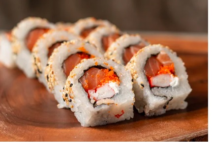 Salmón fresco o tempura, queso crema, aguacate, arroz por fuera con lluvia de sesame negro.