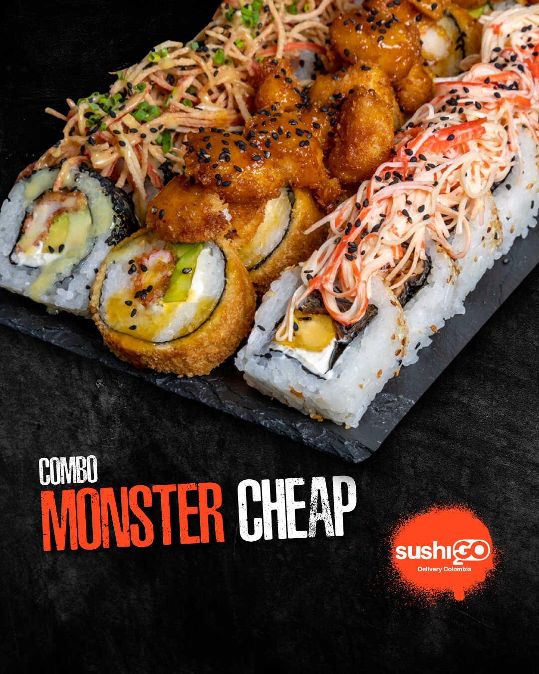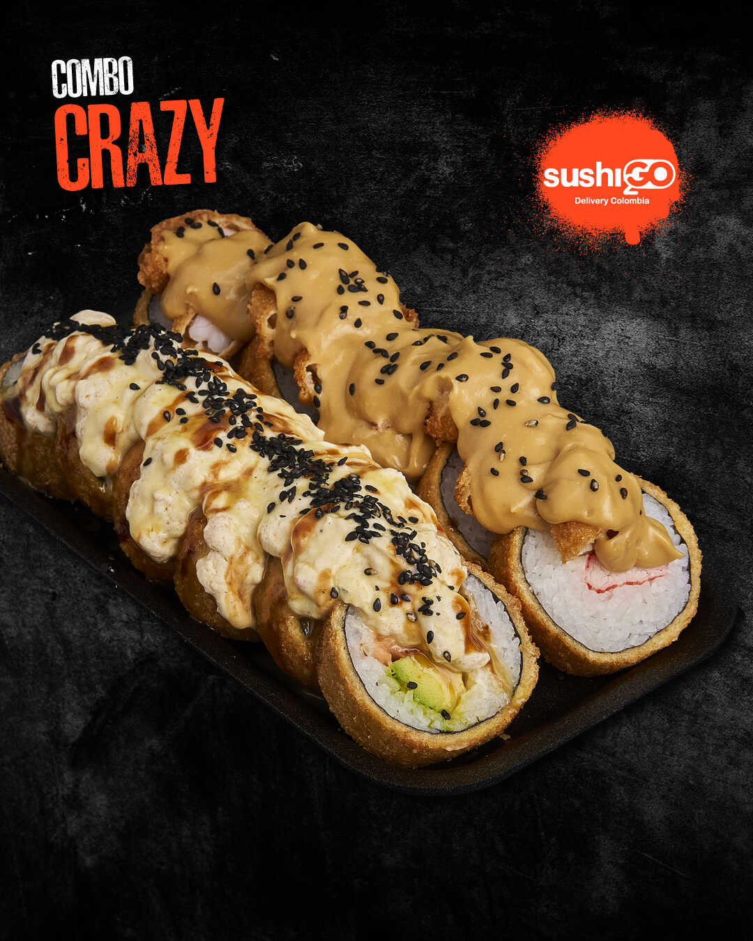 Rollo de kanikama, queso crema y aguacate, topping de sea weed salad,tiras de crunchy crab, camarones crocantes, massago, salsa de la casa y gaseosa 250 ml a elección. 10 bocados