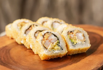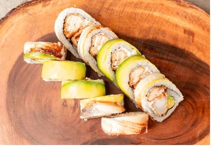 Langostino apanado en queso parmesano, queso crema y aguacate, topping de madurito y queso mozzarella flameado con un toque de teriyaki.