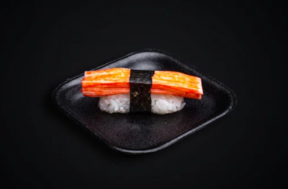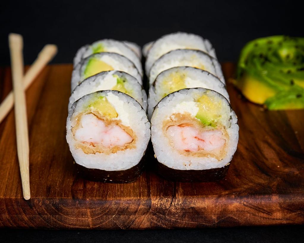 Kanikama crunchy, queso crema y aguacate con topping de camarones crunchy en salsa especial de la casa.