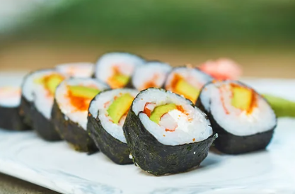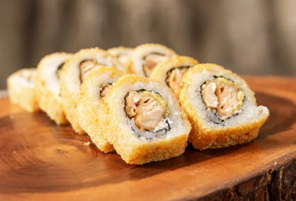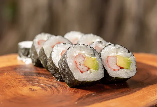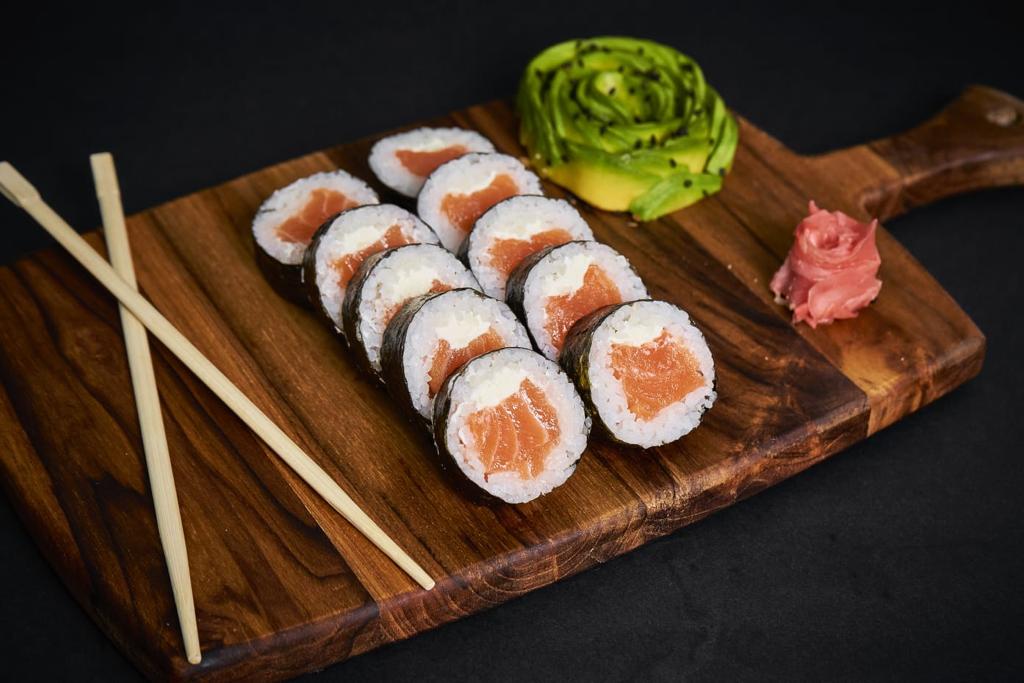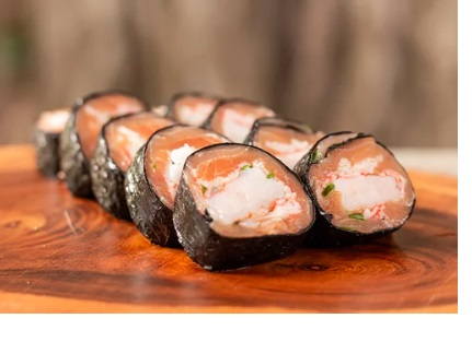 Escoge salmón fresco o tempura, queso crema, alga por fuera.