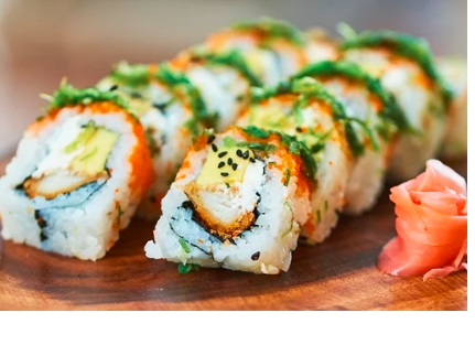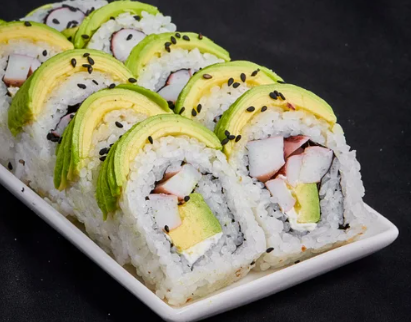 Pescado blanco crocante, aguacate, envueltos en masago y algas marinas.