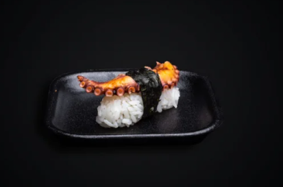 Pulpo, aguacate, queso crema, kanikama spicy, arroz por fuera y sesame negro.