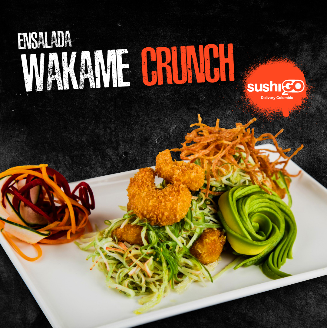 Ensalada de algas marinas, palmito crunchy importado, camarón crunchy, aguacate con aderezo de la casa, con una corona de kanicrunchy de cangrejo.
