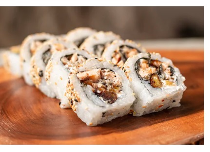 Anguila crunch, queso crema, aguacate, forrado en kanikama y salsa de la casa.