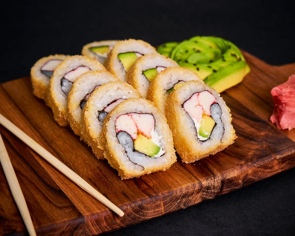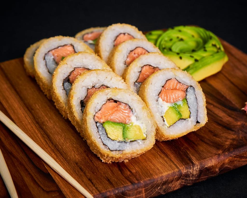 Salmón fresco, queso crema, aguacate, arroz por fuera, todo crocante.