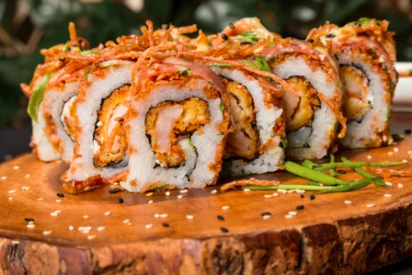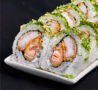 Camarón crunchy, queso crema, arroz recubierto de kanicruch, cebollin chino, topping de jamón serrano y tiras de kanicrunck en salsa kamikaze de la casa y toque de sésamo negro.