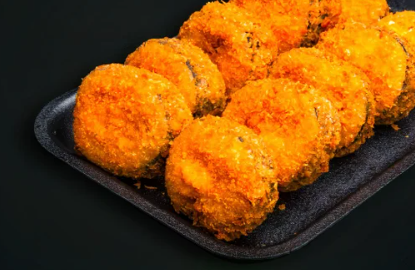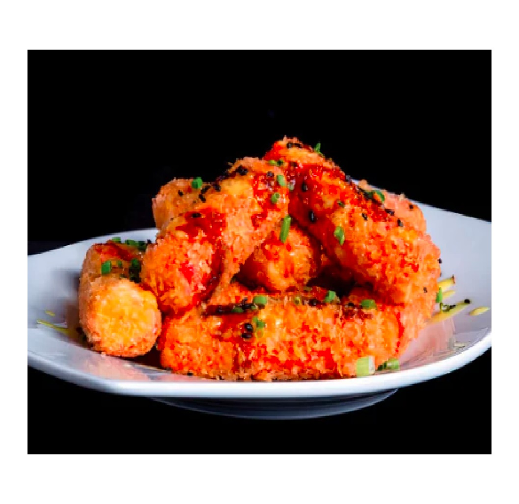 Langostino, queso crema, arroz por fuera, todo crocante.