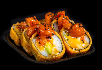 Salmón, queso crema, aguacate y masago, todo crocante bañado en gratinado de salmón.