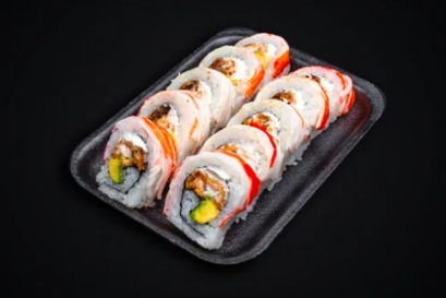 Langostino, queso crema, aguacate, arroz por fuera, semillas de sésamo y topping de kanikama en salsa TNT.