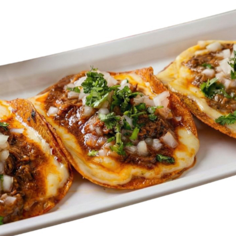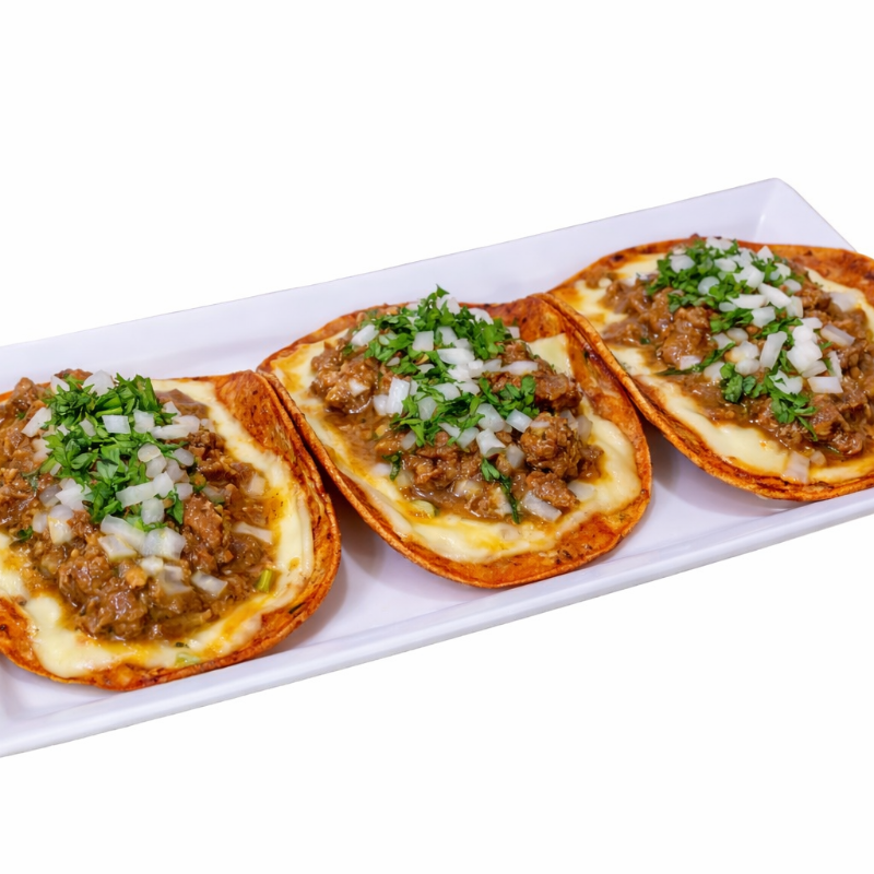 Tortilla, queso cheddar, queso mozarella, carne a elección (pastor, birria) y cilantro fresco.
