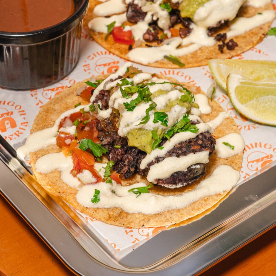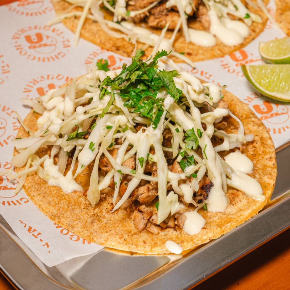 Tortilla de maíz acompañado de pollo en salsa honey, salsa taquera, encurtido de repollo y sour cream.