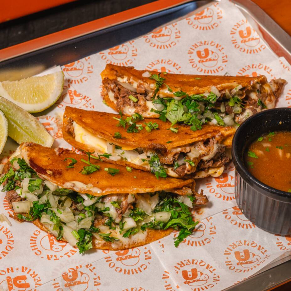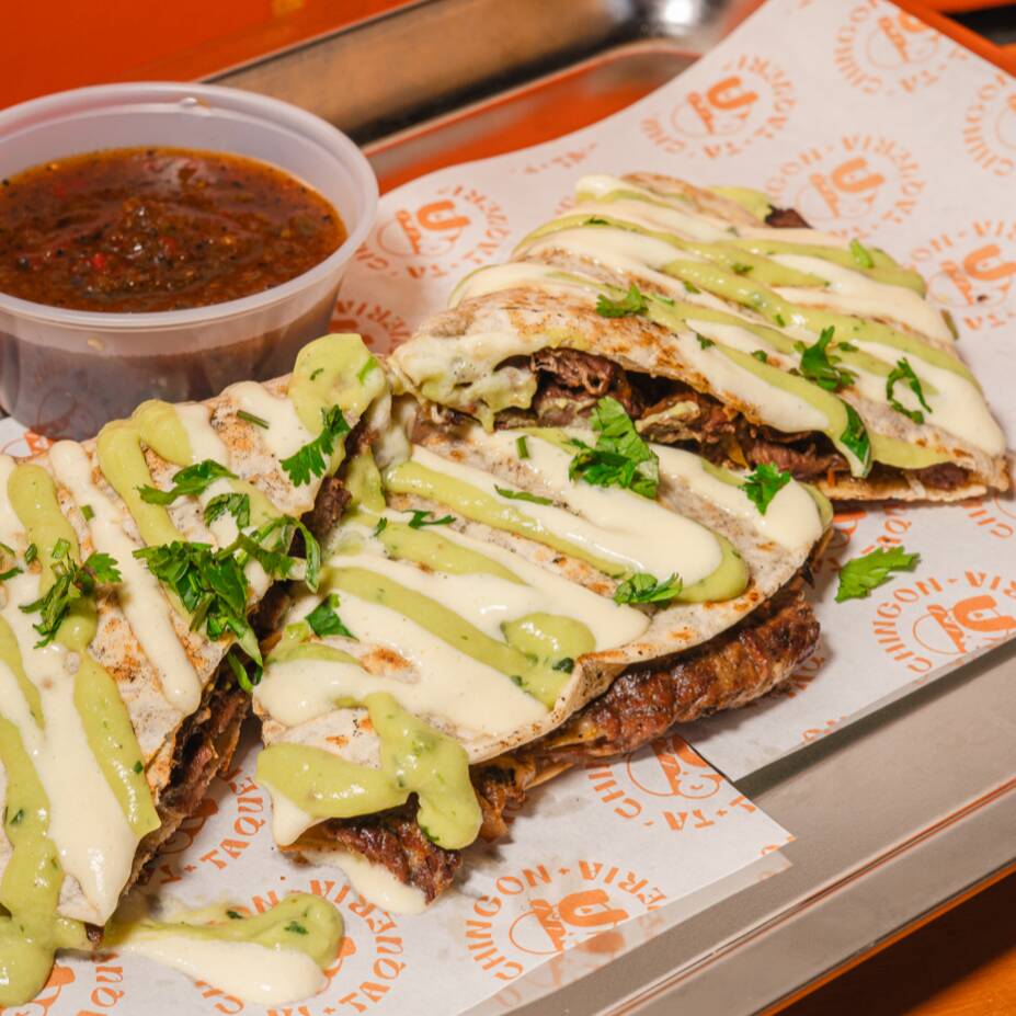 Quesadilla de tortilla de maíz, queso mozzarella, carne de birria, cebolla, cilantro, caldo