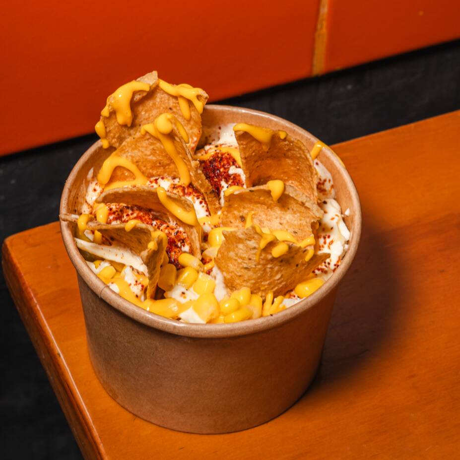 Vaso relleno de maíz en mayo limón, pechuga de pollo a la plancha, salsa queso cheddar, queso rallado y nachos.