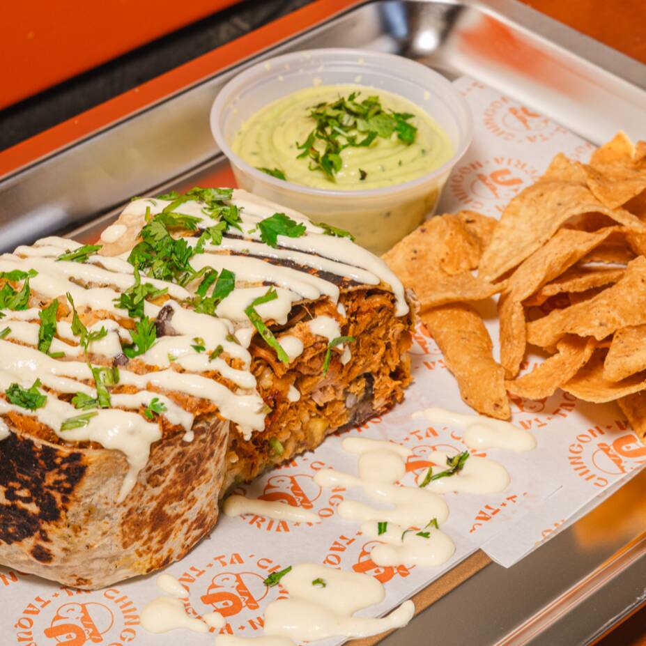 Tortilla de harina, base de arroz mexicano, frijol, Proteina a elección, salsa taquera, pico de gallo, guacamole, sour cream, acompañado de nachos