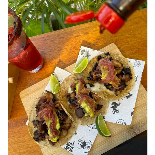 Acompañada de 3 tacos al pastor, 3 cochinita, 3 pollo, guacamole, pico de gallo y salsas picantes para compartir.