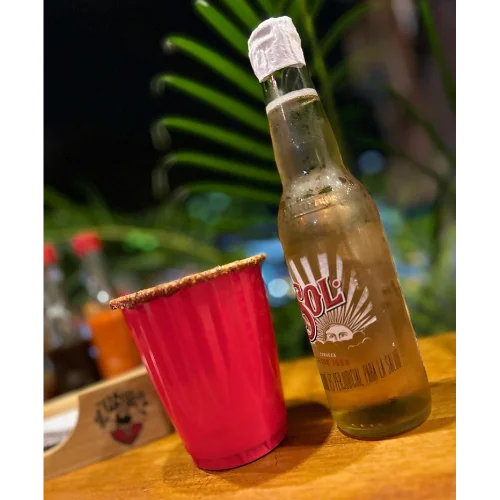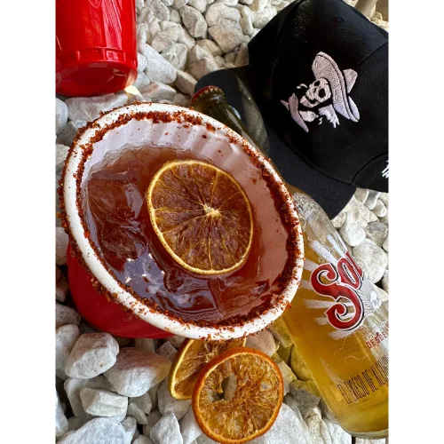 Cerveza, mix mexicano, jugo de tomate, chelada con tajin.