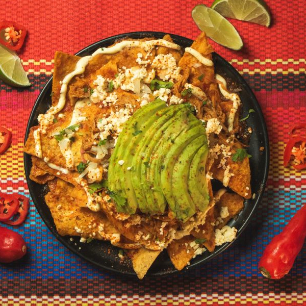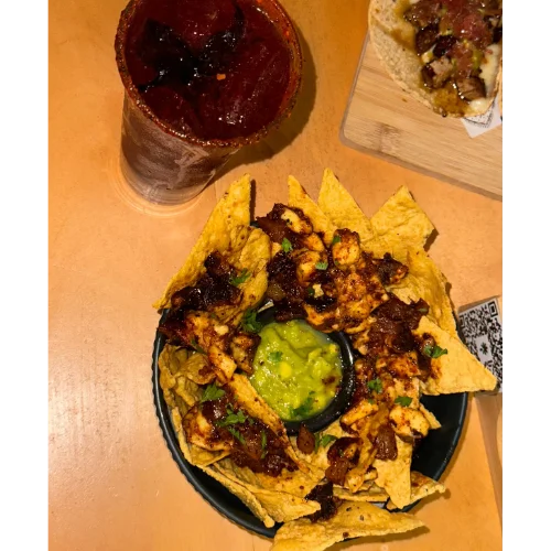 Acompañado de cochinita, guacamole, mix de quesos y crema, cebolla, cilantro y un toque de tajin.