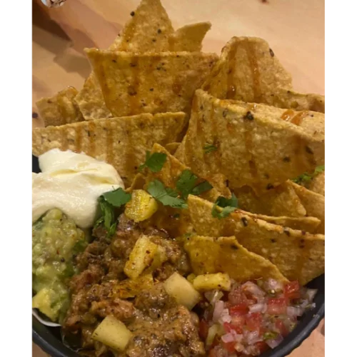 Nachos al pastor bañados en mermelada de jalapeño (picante suave), piña, guacamole, pico de gallo, sour cream.