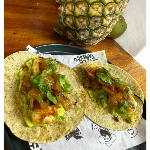 Tacos x3 Queso a la plancha con piña, guacamole y la clásica salsa borracha. ¡Veggie favorito!