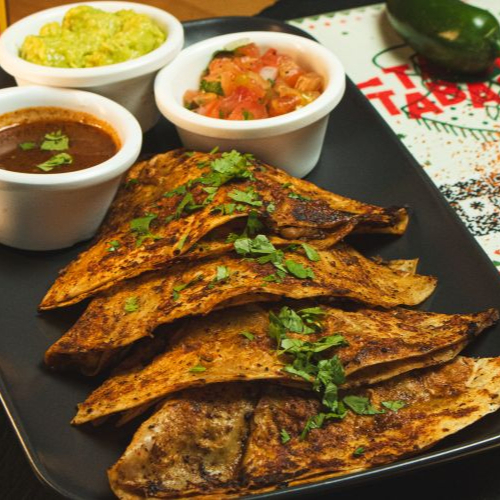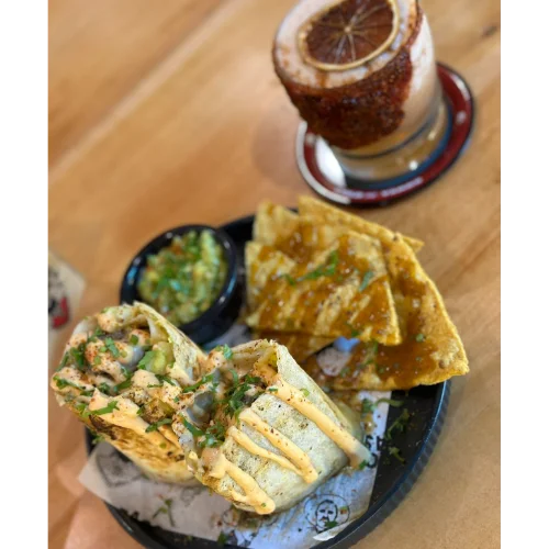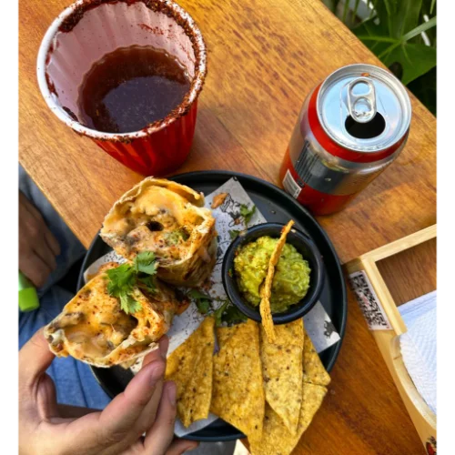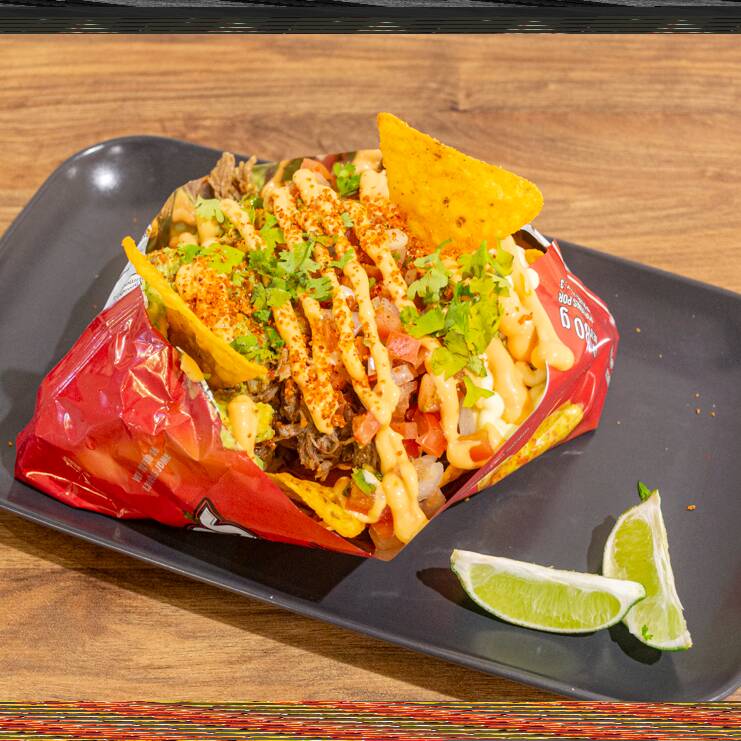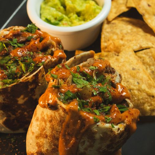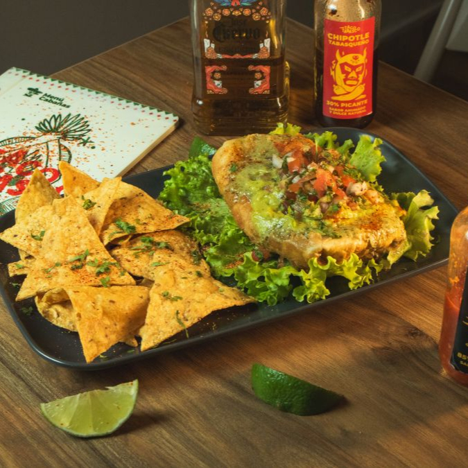 Tortilla de trigo con lomo de res, mix quesos, salsa taquera, lechuga y guacamole, acompañado de totopos.