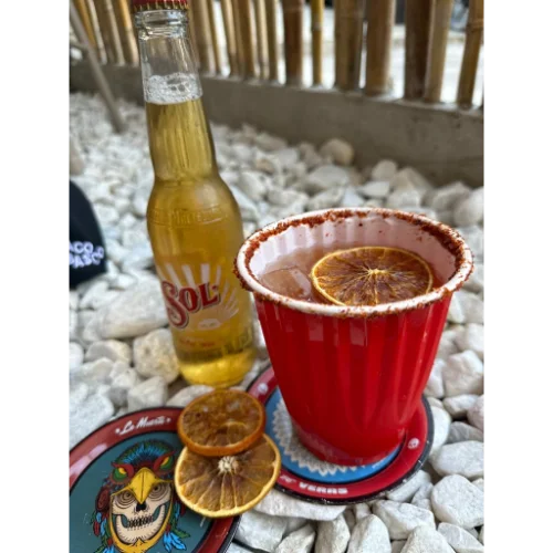 Mezcal con mezcla de sabores mexicanos y cerveza club negra.
