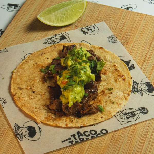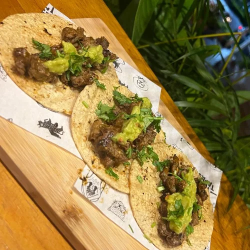 Tacos x3 Solomito de res sellado a la plancha bañado en salsa taquera y guacamole.
