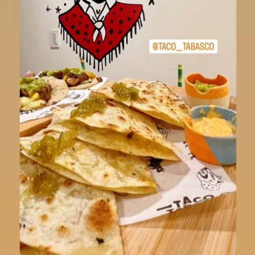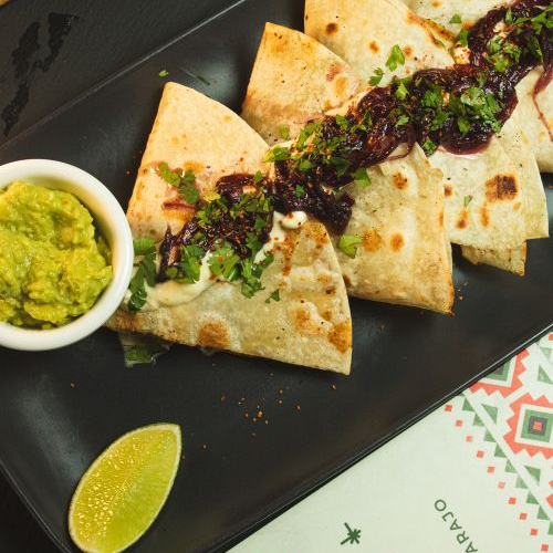 Tortilla de trigo con carne al pastor, mix de quesos, refrito, guacamole y totopos