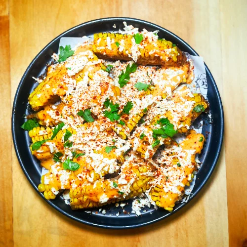 Mazorca asada con mantequilla, queso rallado, chile en polvo y limón.