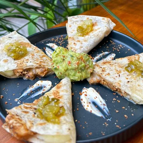 Tinga de pollo con mix de quesos, mermelada de tomatillo. Acompañado con guacamole, viene por 4 triangulos grandes, viene por 4 triangulos grandes