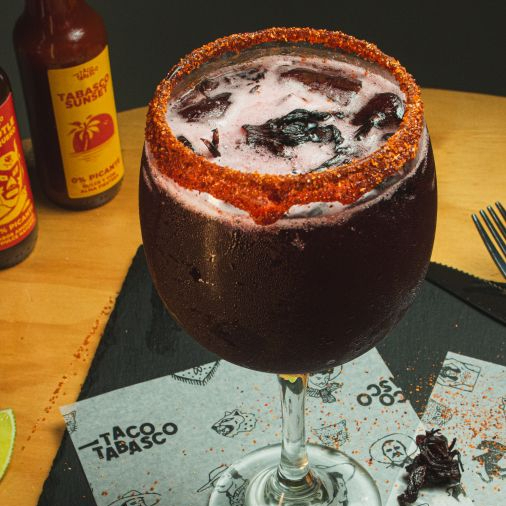 Tortilla de trigo envuelta con birria, pico de gallo mix de quesos,guacamole,elote,mayonesa de chiles y salsa tabasco sunset