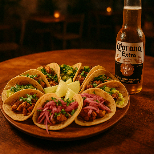 Acompañada de 3 tacos al pastor, 3 cochinita, 3 pollo, guacamole, pico de gallo y salsas picantes para compartir.