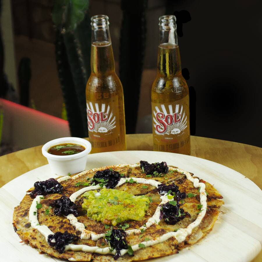 Frijol refrito, mermelada de tomatillo, cebolla morada, pico de gallo y queso. Acompañado de guacamole