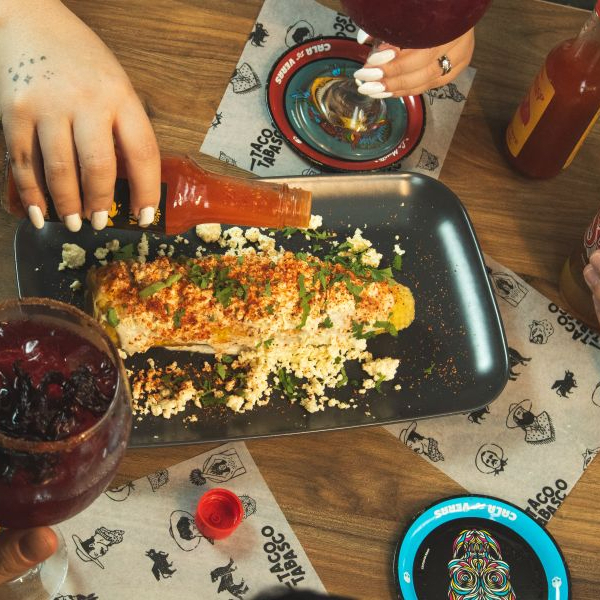 Totopos con queso asado en salsa taquera, piña borracha y guacamole.
