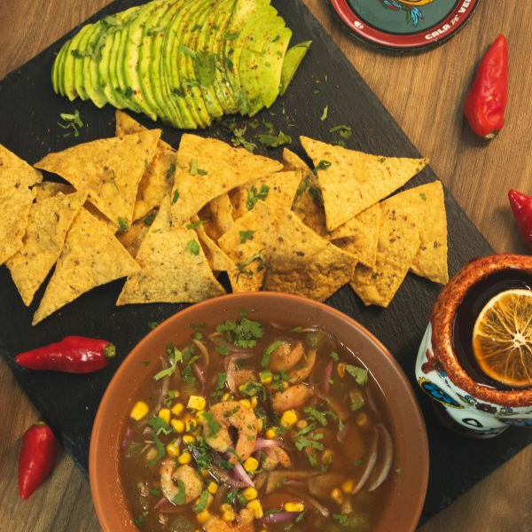 Camarón fresco y cortes de pesca blanca, marinados en jugo de limón, chile, cilantro, cebolla morada y pepino servidos con aguacate en tortilla de maiz
