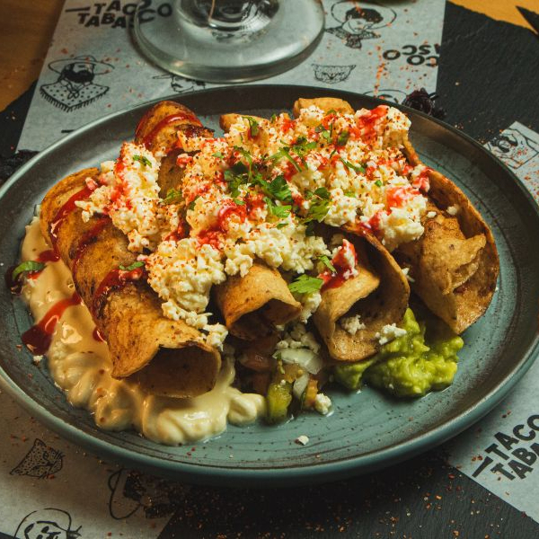 Crujientes flautas ritas rellenas de cochinita pibil, acompañadas de guacamole, sour cream, pico e gallo y salsa de la casa