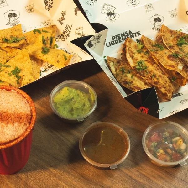 Combo para compartir (entrada, dos fuertes y bebidas): totopos de cochinita, taquiza personal, burro al pastor y dos limonadas de tamarindo.