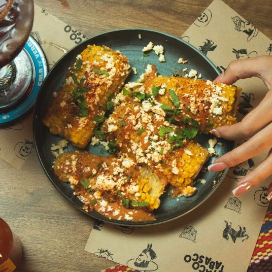 Tiras de mazorca con mayonesa de chiles, queso costeño y cilantro.