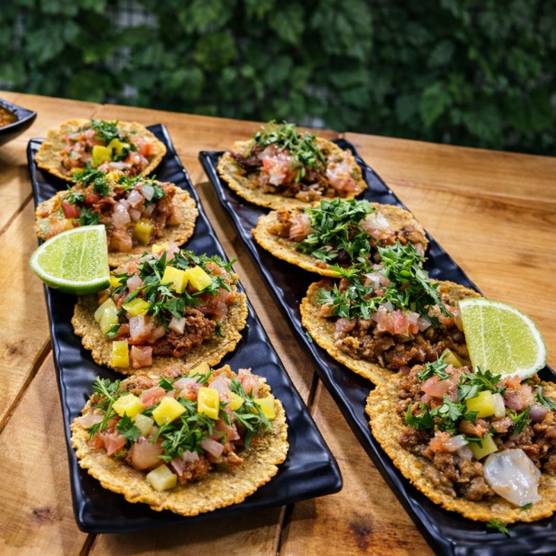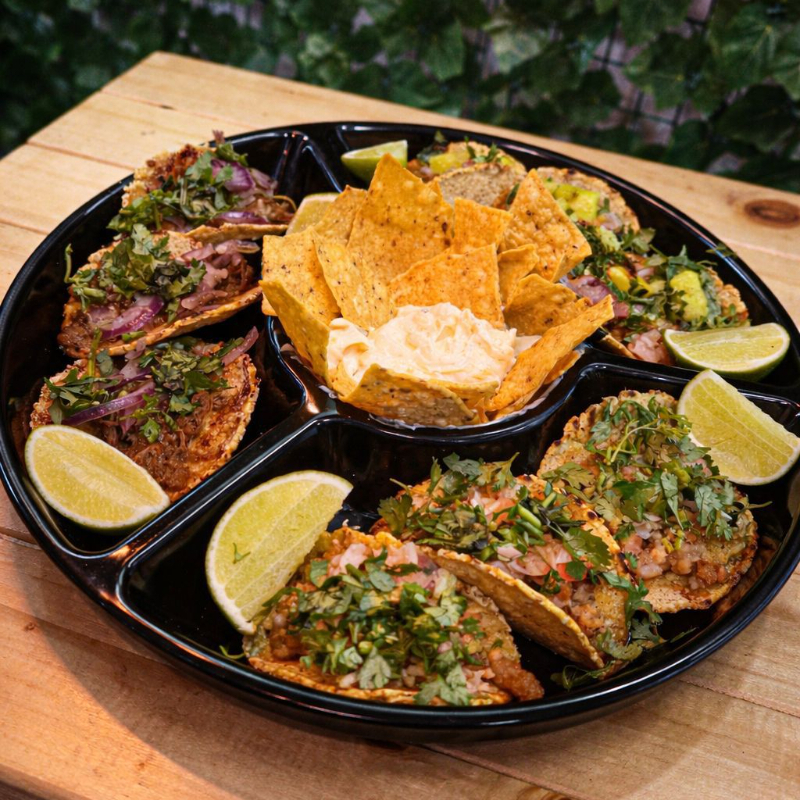 6 tacos al pastor, 6 tacos de carnitas, 6 tacos de birria y nachos con salsa de la casa