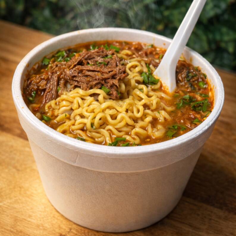 Ramen en caldo de birria con carne de res desmechada cocida lentamente en su jugo, queso mozzarella y cilantro fresco. Un plato caliente, intenso y lleno de sabor.