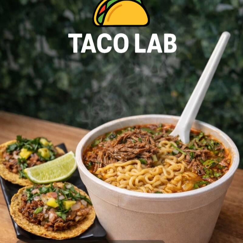 Birriamen y 2 tacos a elección entre Taco al pastor y Carnitas.