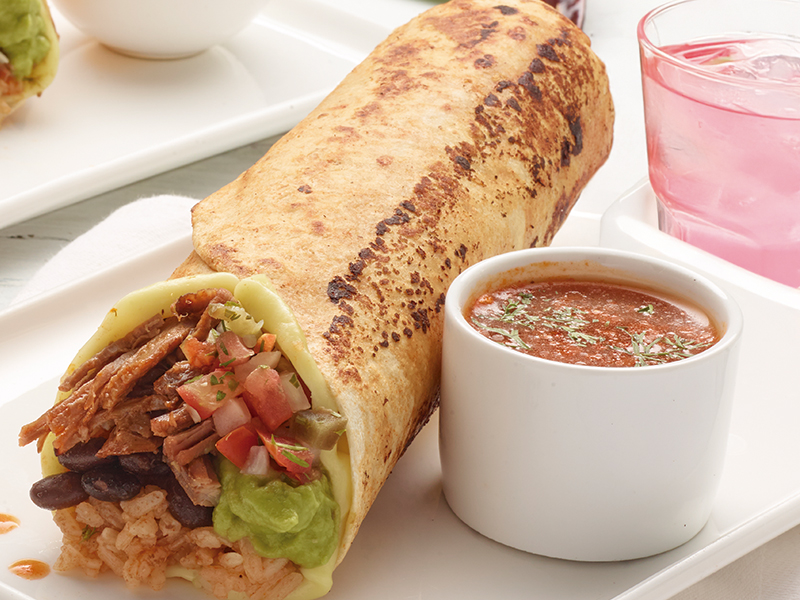 Burrito con cerdo desmechado, acompañado con nachos, mayoguacamole y bebida de 400ml.