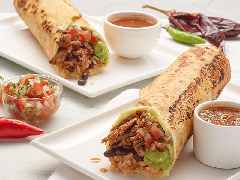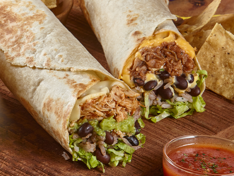 1 Burrito de pollo desmechado y 1 Burrito de cerdo desmechado.