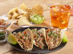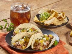 Tres tacos con cerdo desmechado y trozos de piña, acompañados con nachos, mayoguacamole y bebida 400ml.