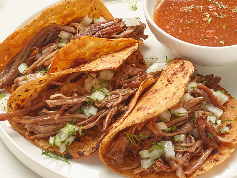 Tres tacos con carne de res desmechada, pico de gallo y cilantro, acompañados con limón.