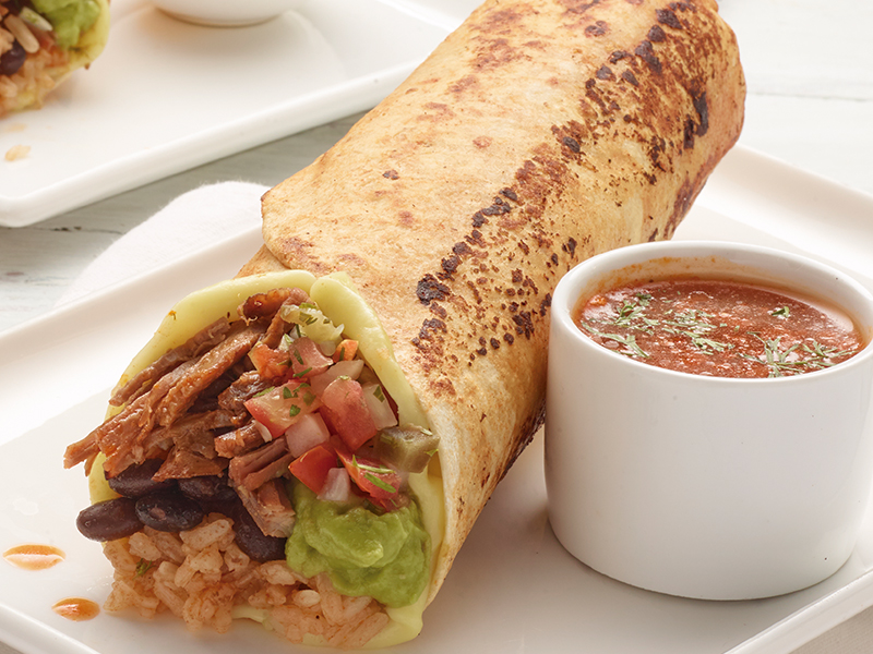 Burrito con champiñones salteados a la plancha, arroz, frijol, lechuga batavia, queso mozarella, pico de gallo y guacamole.